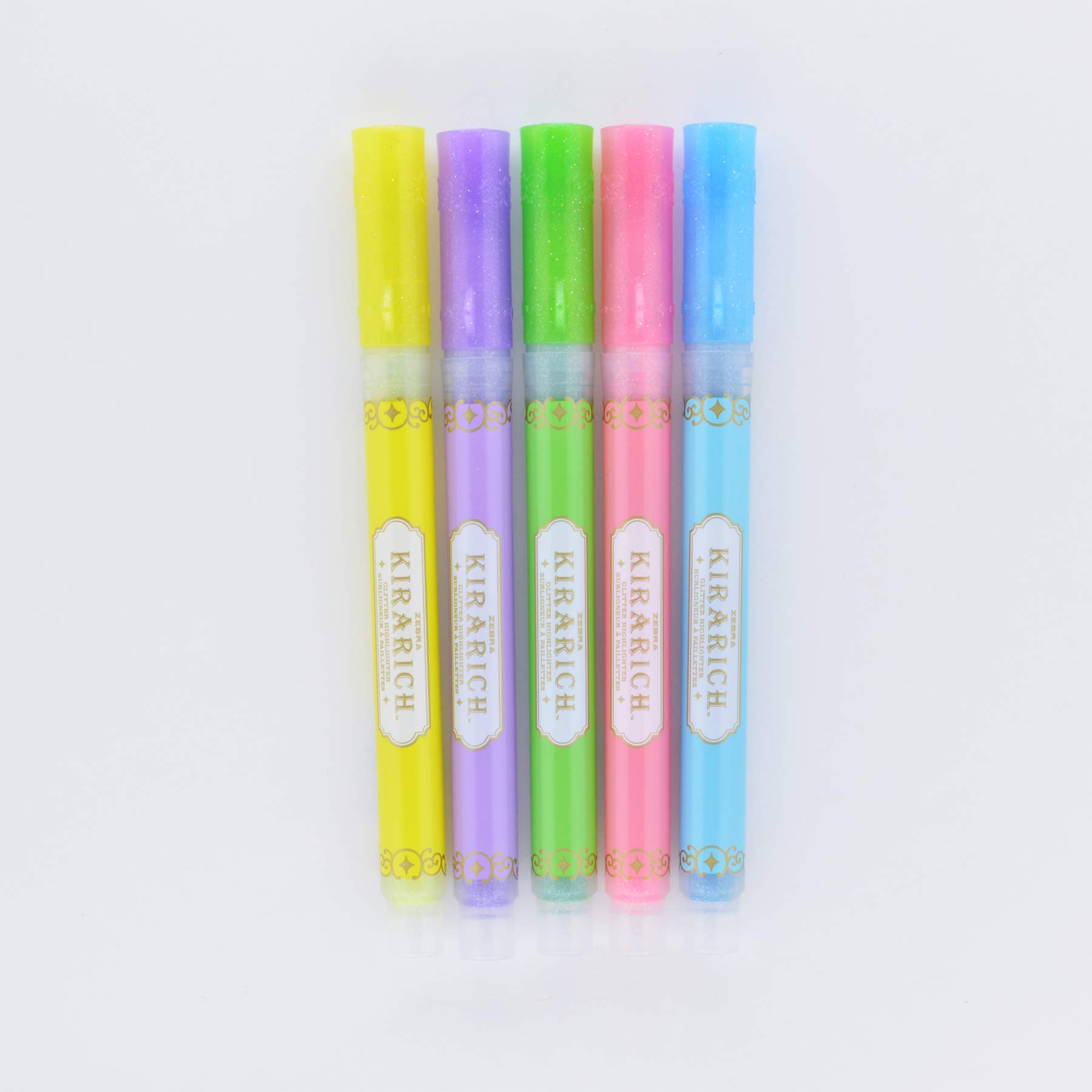 Zebra Pen, KIRARICH Glitter Highlighter, 5 Assorted Colors, Chisel Tip for Broad or Fine Lines, Water-Based Pigment Ink with Glitter Effect for Notes, Journals, Planners, 5-Pack (71605)